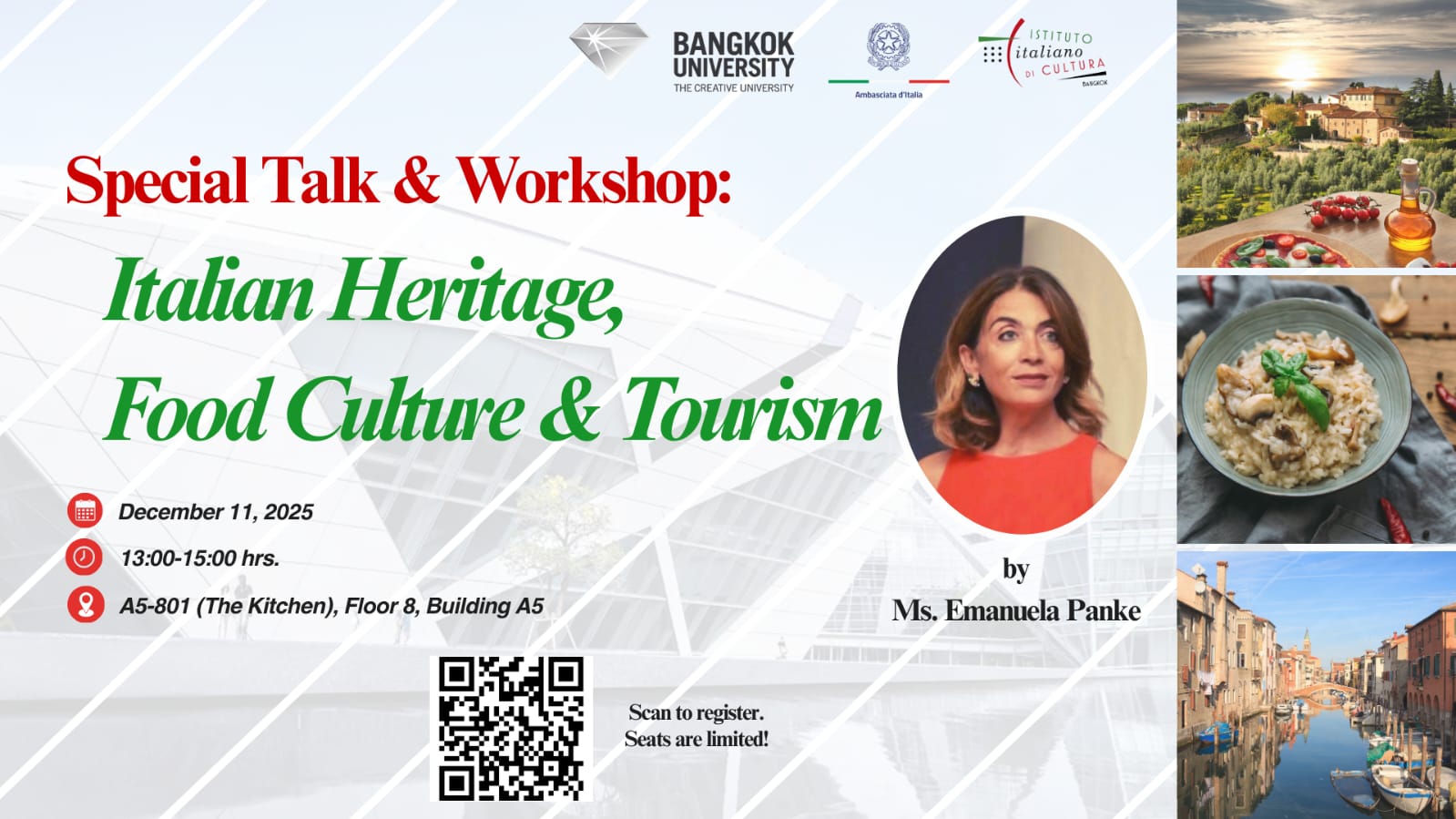 On December 11th, Bangkok University hosts the Special Talk & Workshop “Italian Heritage, Food Culture & Tourism”, a deep dive into Italy’s rice tradition through two of its most iconic dishes: risotto and arancini.