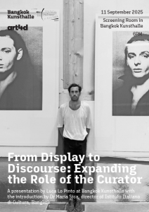 Presentazione di Luca Lo Pinto al Bangkok Kunsthalle, con introduzione della Dott.ssa Maria Sica, Direttrice dell’Istituto Italiano di Cultura di Bangkok. La conferenza esplorerà come la pratica curatoriale possa diventare uno strumento per costruire situazioni con molteplici punti di accesso—sia visivi che concettuali—offrendo al pubblico una vasta gamma di possibilità e favorendo la coesistenza di […]