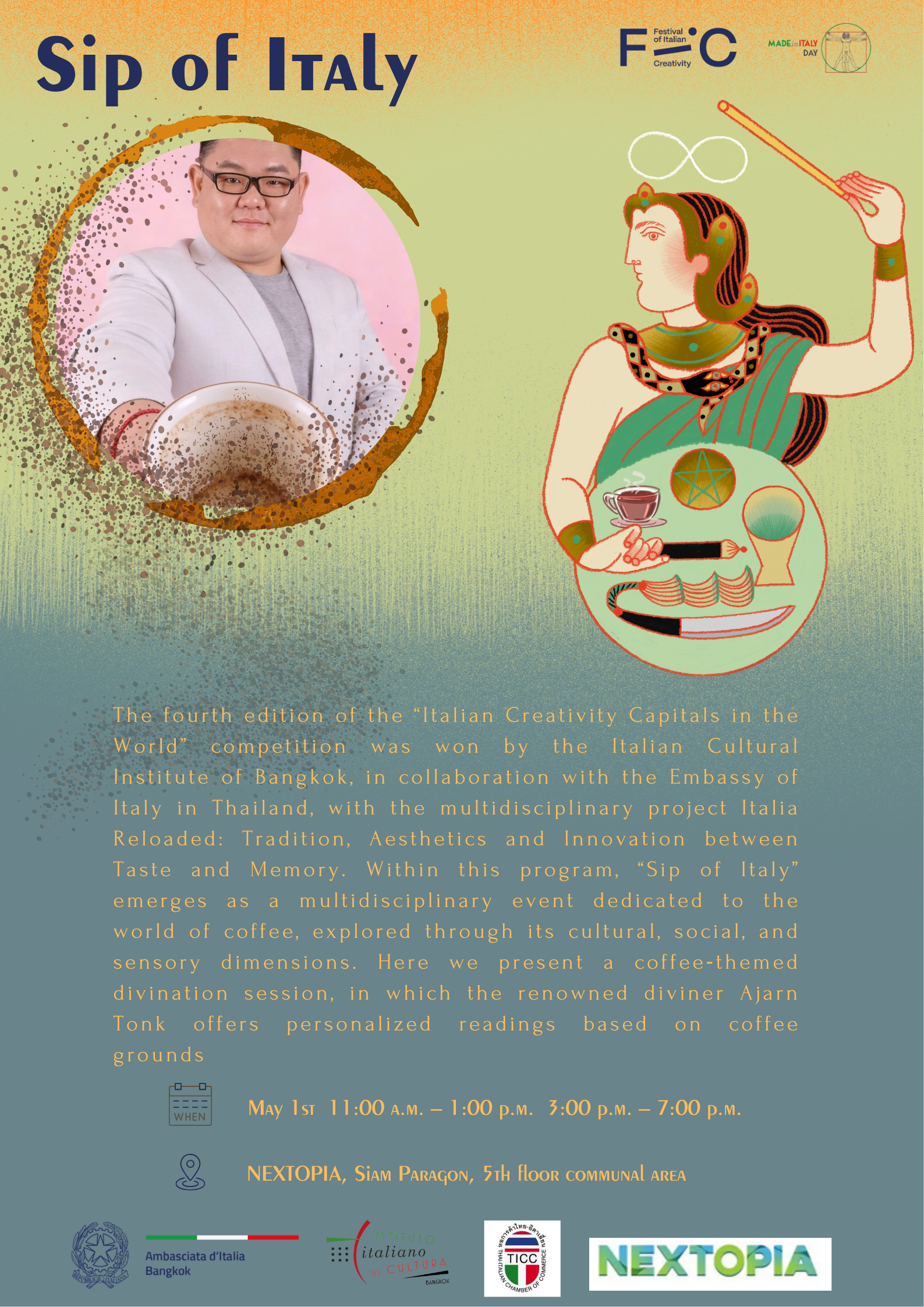La quarta edizione del concorso “Capitali della Creatività Italiana nel Mondo” ha visto vincitore l’Istituto Italiano di Cultura di Bangkok, in collaborazione con l’Ambasciata d’Italia in Thailandia, grazie al progetto multidisciplinare “Italia Reloaded. Tradition, Aesthetics and Innovation between Taste and Memory”. All’interno di questo programma si inserisce “Sip of Italy”, un evento multidisciplinare dedicato al mondo del caffè, esplorato nelle sue dimensioni culturali, sociali e sensoriali.