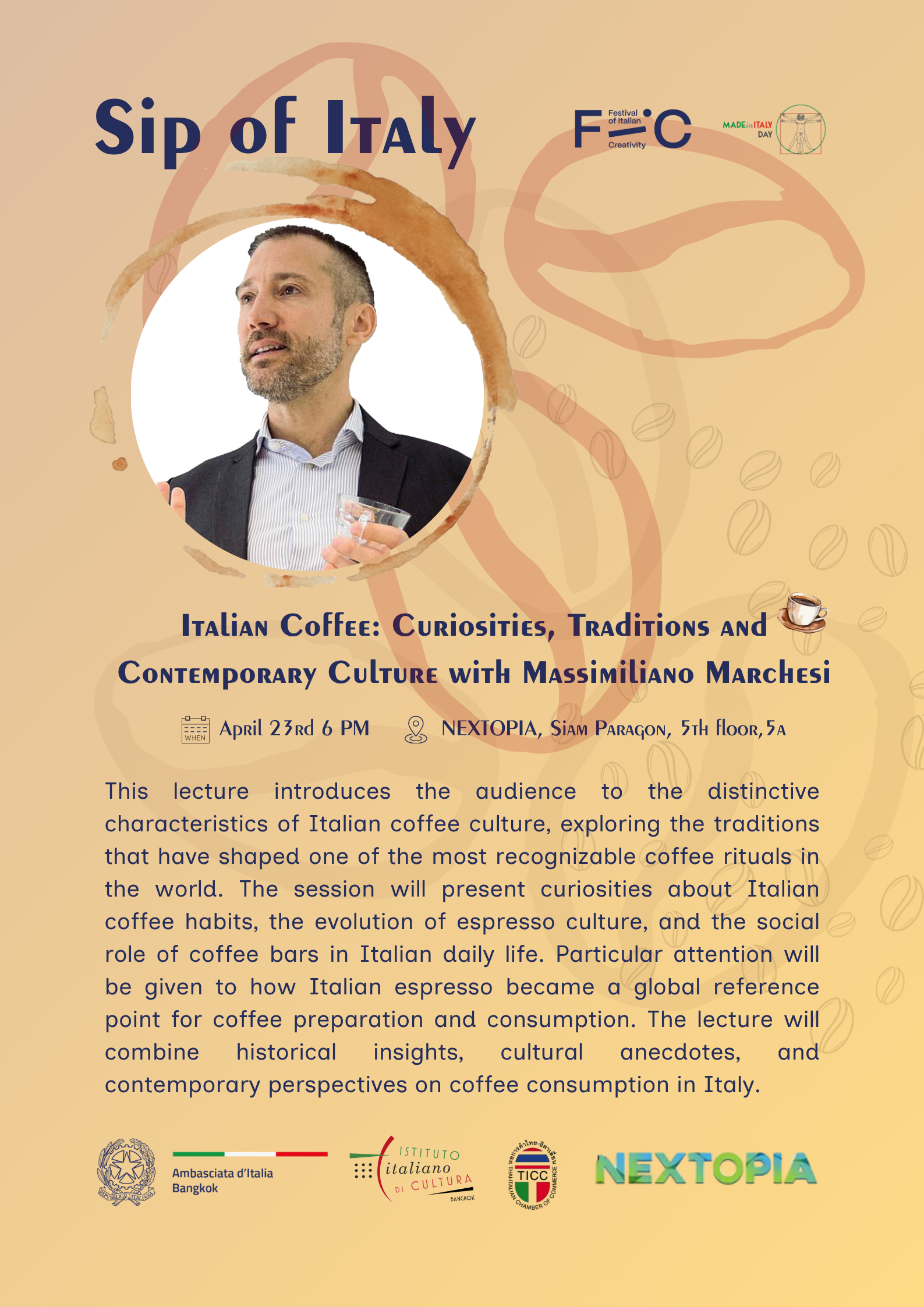 La quarta edizione del concorso “Capitali della Creatività Italiana nel Mondo” ha visto vincitore l’Istituto Italiano di Cultura di Bangkok, in collaborazione con l’Ambasciata d’Italia in Thailandia, grazie al progetto multidisciplinare “Italia Reloaded. Tradition, Aesthetics and Innovation between Taste and Memory”. All’interno di questo programma si inserisce “Sip of Italy”, un evento multidisciplinare e dedicato al mondo del caffè, esplorato nelle sue dimensioni culturali, sociali e sensoriali.