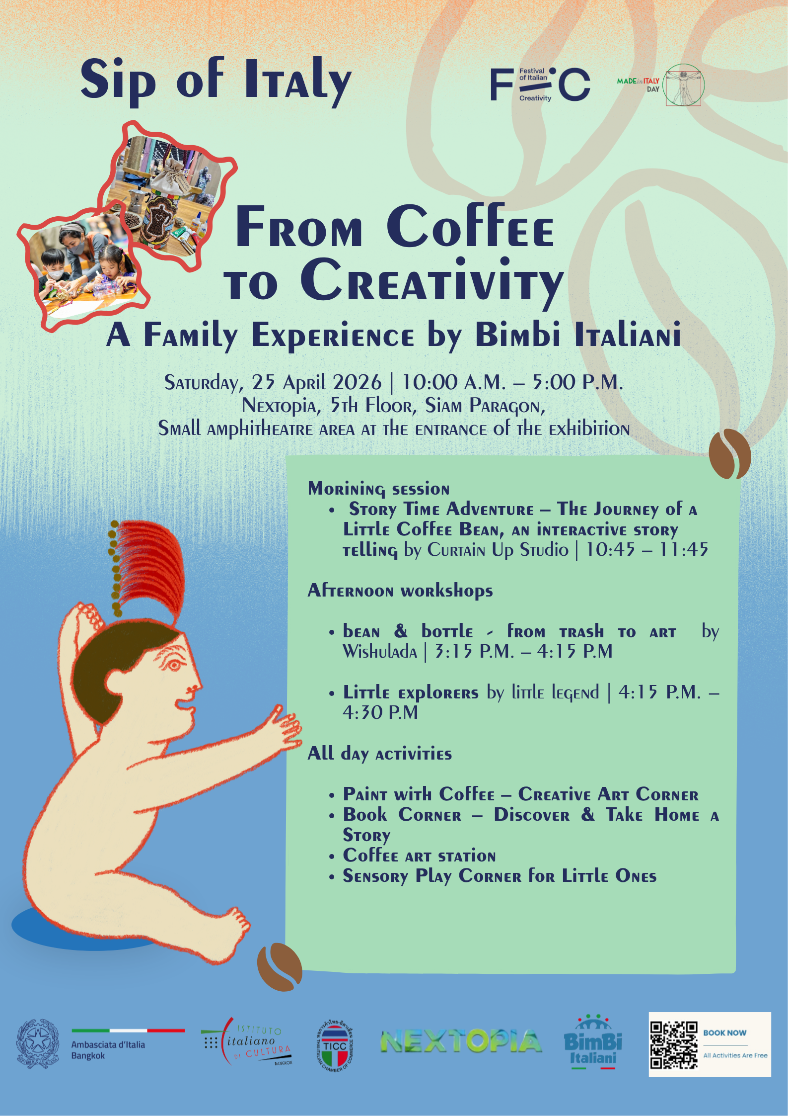 • Story Time Adventure – Il viaggio di un piccolo chicco di caffè, narrazione interattiva a cura di Curtain Up Studio | 10:45 – 11:45