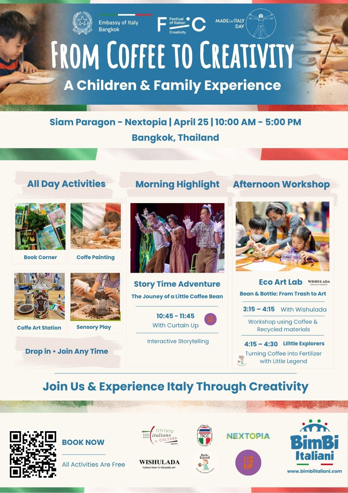 Nel contesto di “Sip of Italy”, Bimbi Italiani – un’organizzazione internazionale no-profit dedita alla promozione della cultura italiana tra i bambini, giovani e famiglie di tutto il mondo- propone un’intera giornata di attività . Di seguito il programma delle attività: